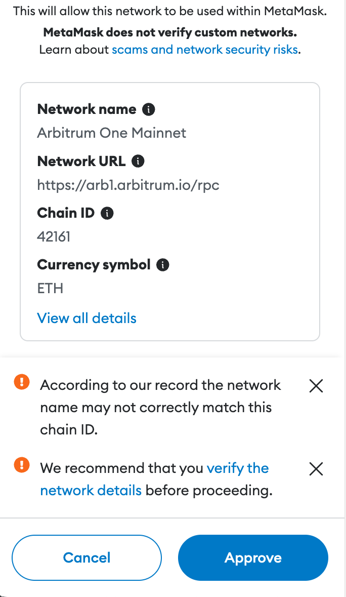 • Once you click the button you will see a MetaMask notification, now click on Approve. You will be directed to Arbitrum's Mainnet in the network dropdown list. You can now close the dialog.